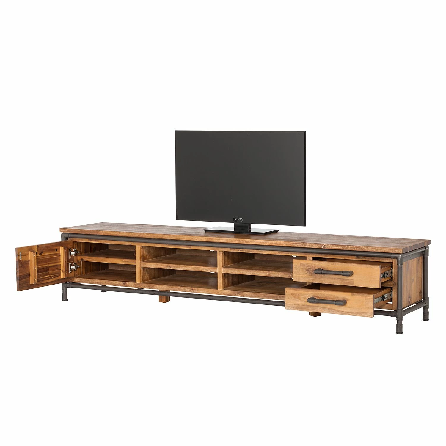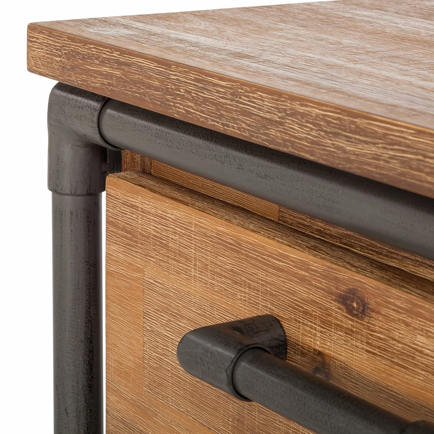 - Plateau supérieur, porte et tiroirs : acacia massif teinté et brossé