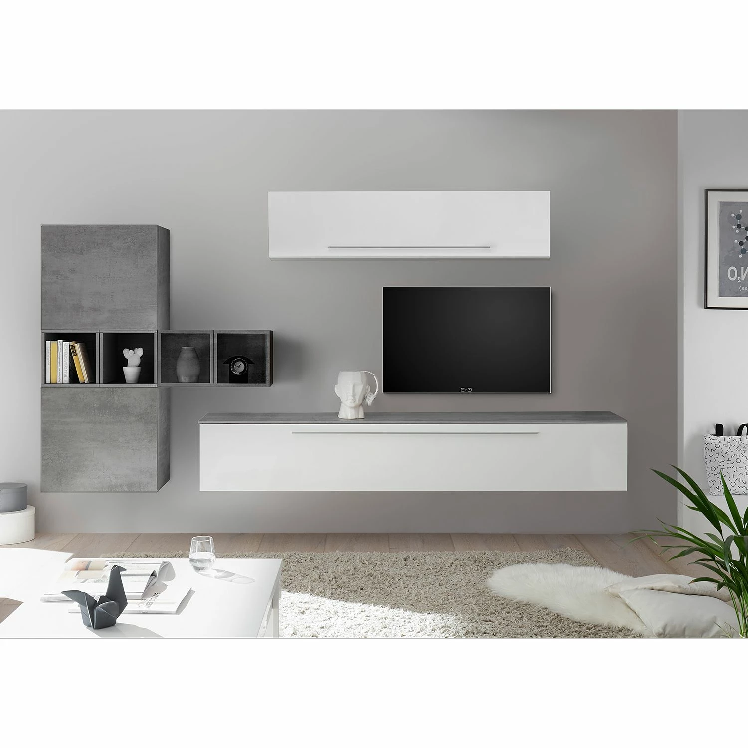 - Meuble TV et éléments muraux : blanc brillant / blanc