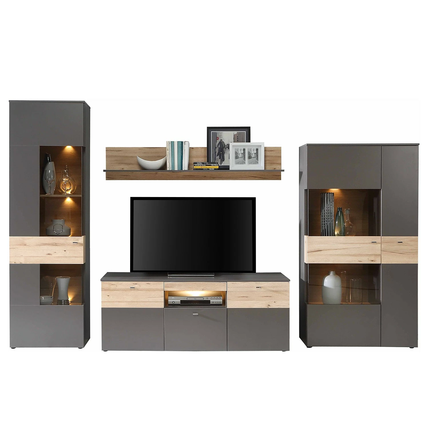 - Contenu de la livraison : Ensemble comprenant 1 vitrine, 1 tablette murale, 1 meuble TV et 1 buffet haut, avec éclairage et sans accessoires