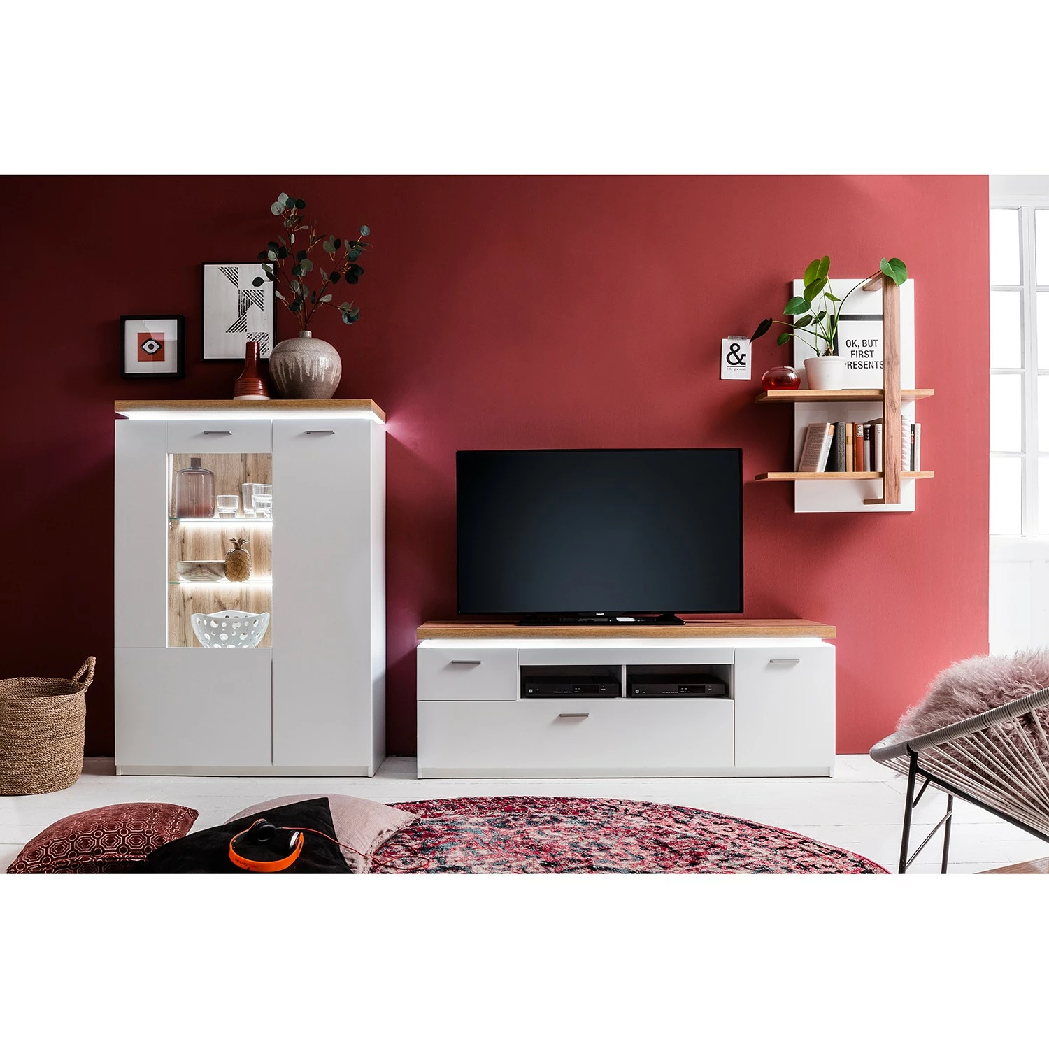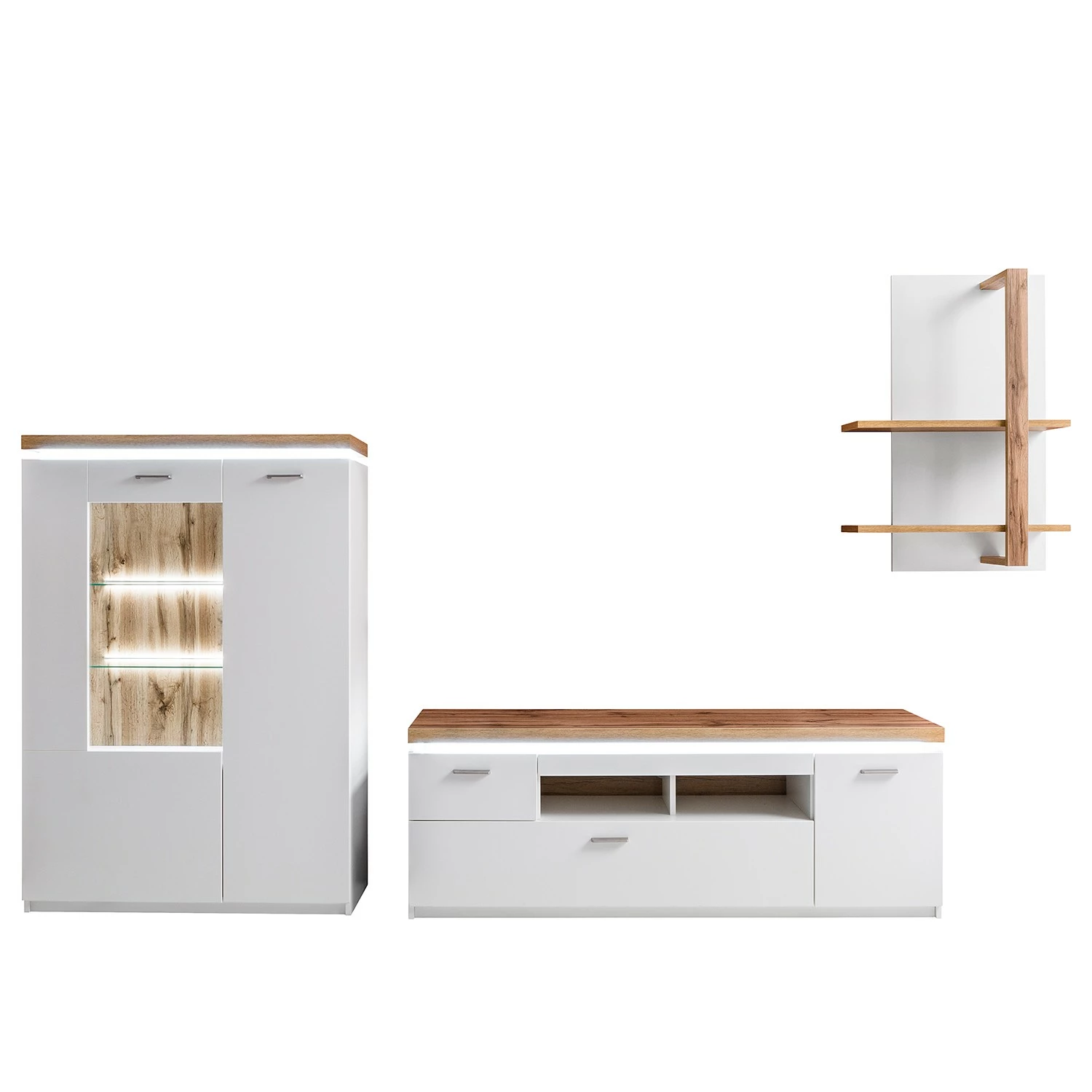 - Contenu de la livraison : 1 buffet haut, 1 meuble TV et 1 étagère murale avec éclairage, sans accessoires