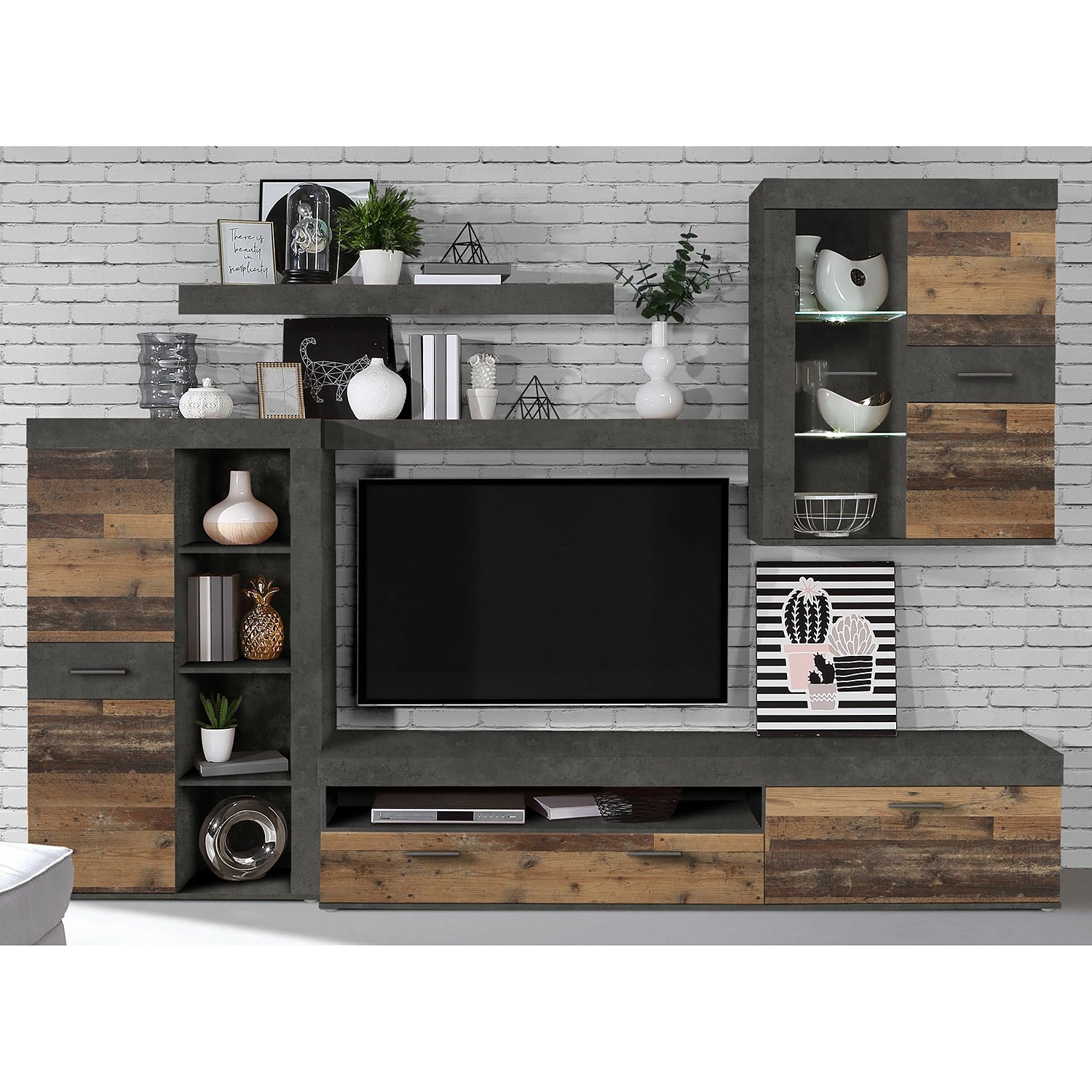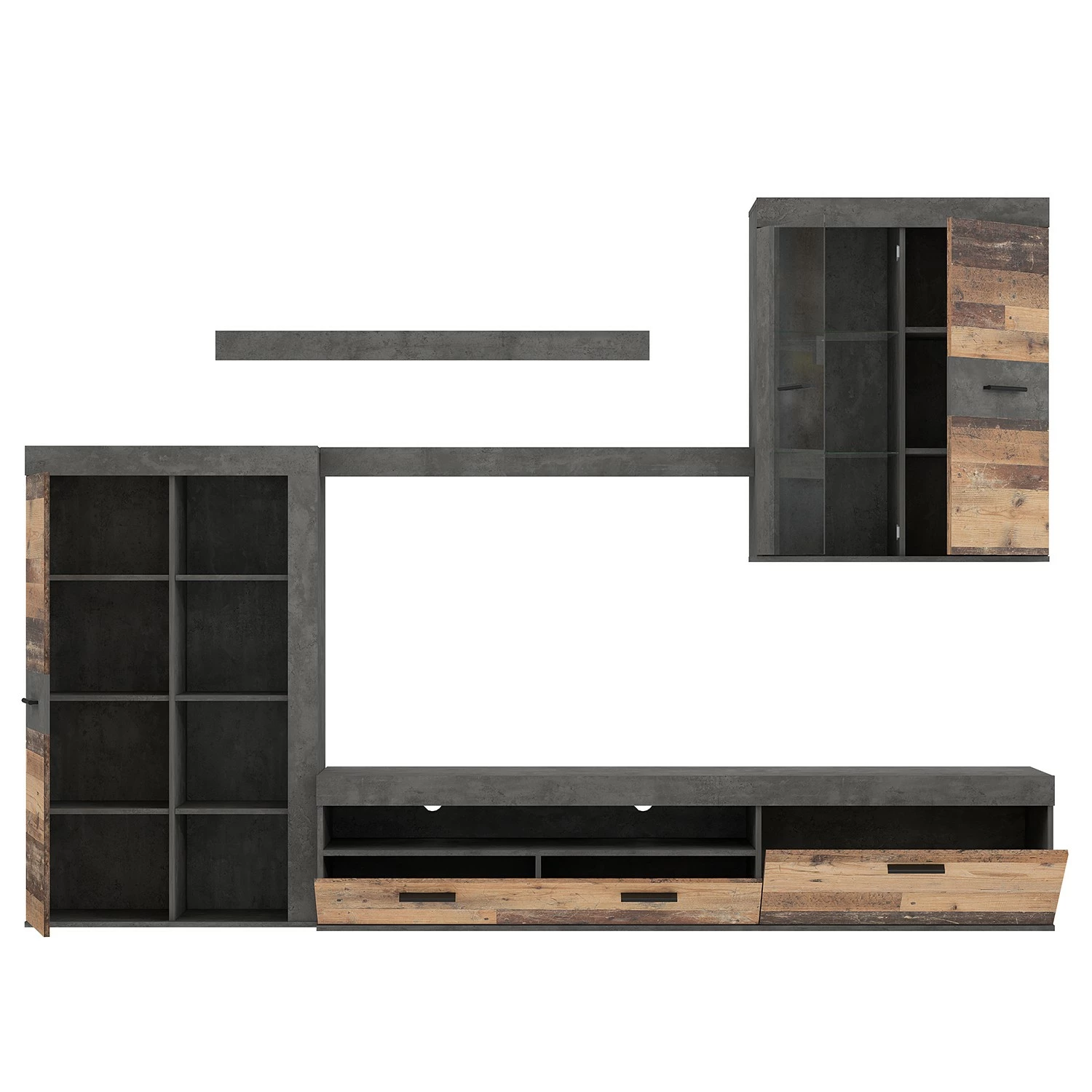 - Contenu de la livraison : Ensemble comprenant 1 buffet, 1 tablette murale, 1 meuble TV et 1 vitrine murale, sans accessoires