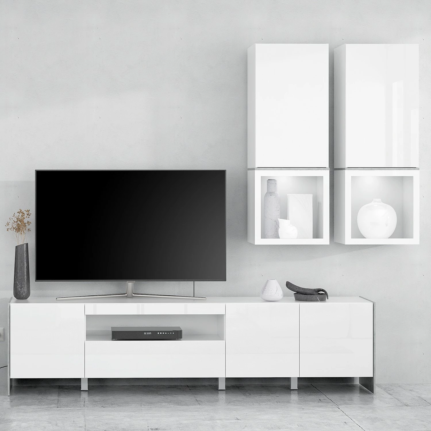 - Contenu de la livraison : Ensemble comprenant 1 meuble TV et 2 meubles hauts avec éclairage inclus, sans accessoires