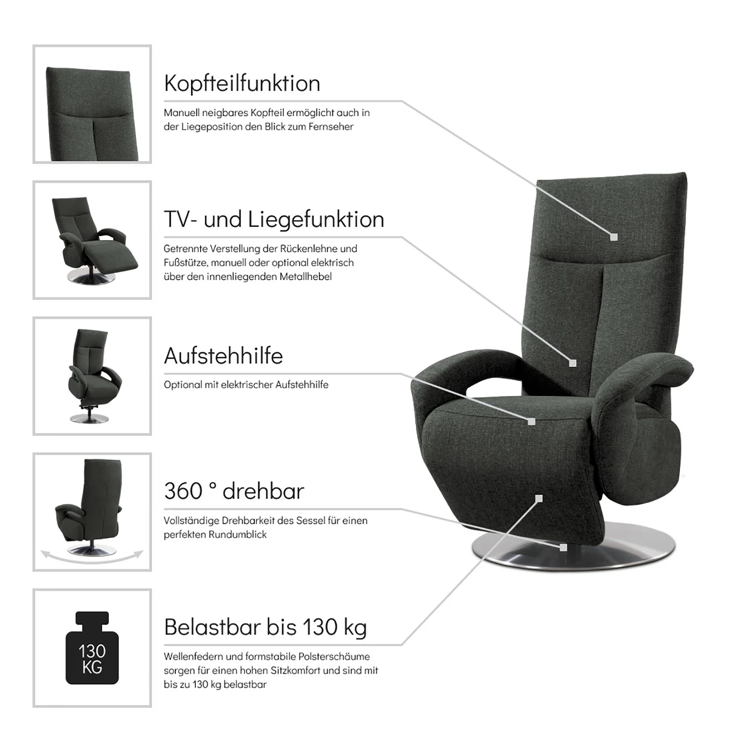 Le fauteuil est très joli et s’intègre bien dans mon intérieur. La fonction relaxation est agréable, mais j’aurais aimé un peu plus de confort. Dans l’ensemble, je suis satisfaite de mon achat.