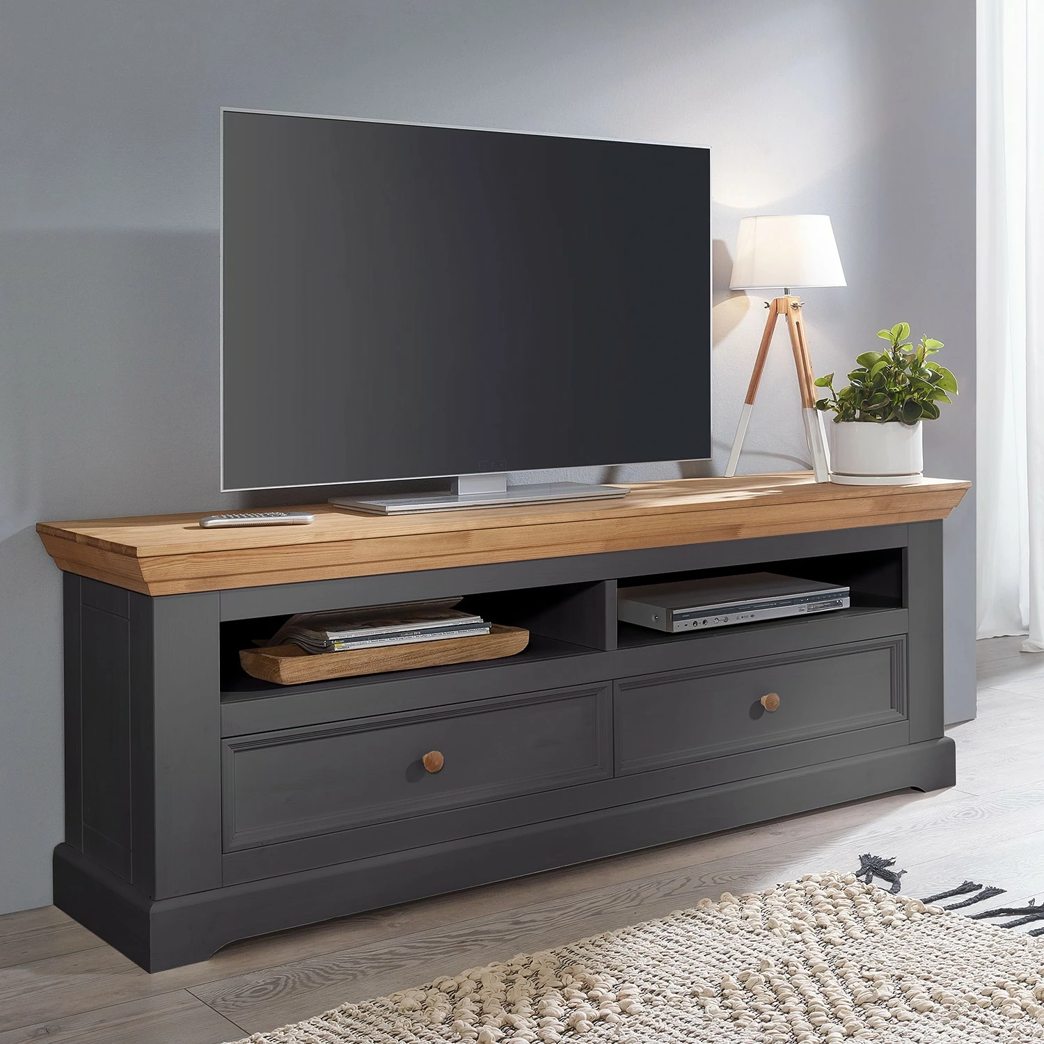 - Corniche décorative et poignées : pin massif verni