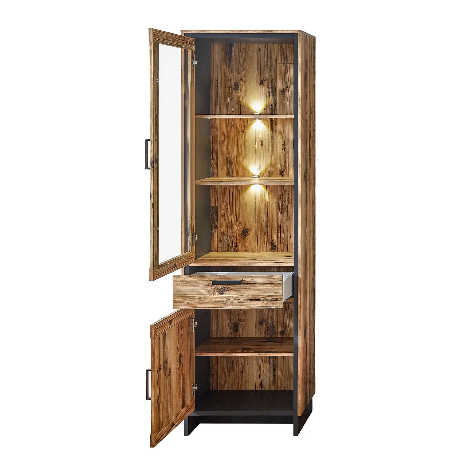 - Contenu de la livraison : Ensemble comprenant 1 vitrine, 1 tablette murale, 1 meuble TV et 1 buffet haut avec éclairage, sans accessoires